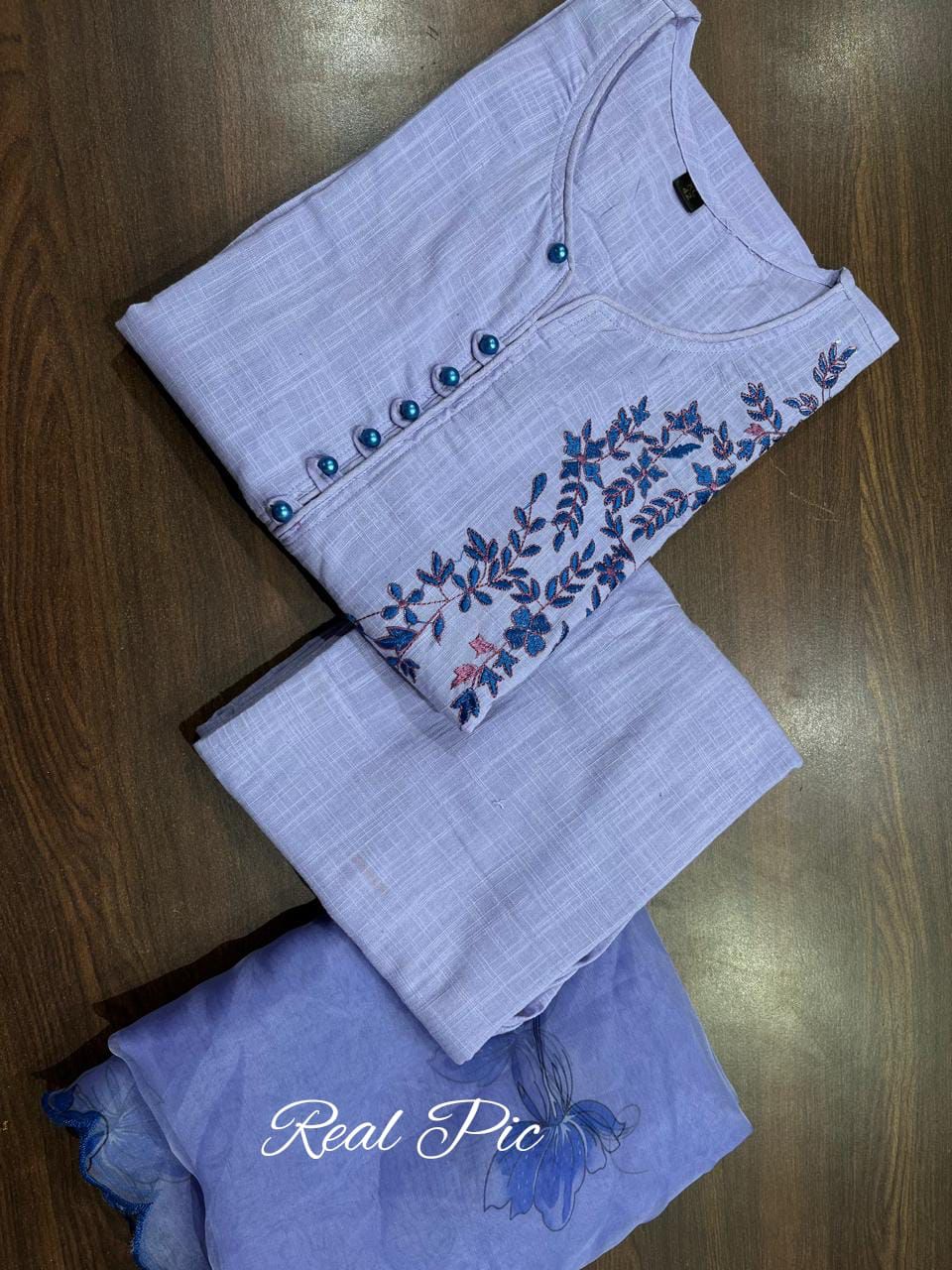 This lightweight handloom South cotton Lavender suit features delicate thread manual embroidery complemented by pearl-matched buttons. It is paired with an organza dupatta showcasing a digital print and scalloped edges for an elegant finish.